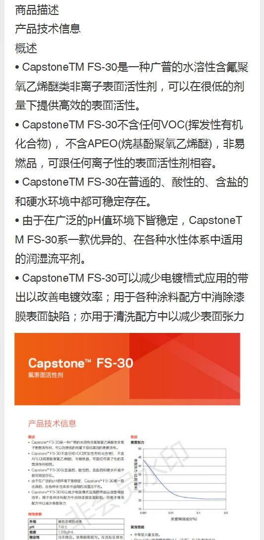 美国杜邦FS-30 强酸强碱水溶性含氟聚氧乙烯醚类非离子表面活性剂